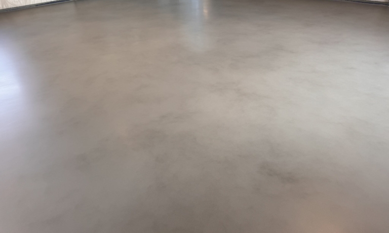 We sprayden met een complementair kleur een design op de vloer om een industriëel uitzicht te bekomen.